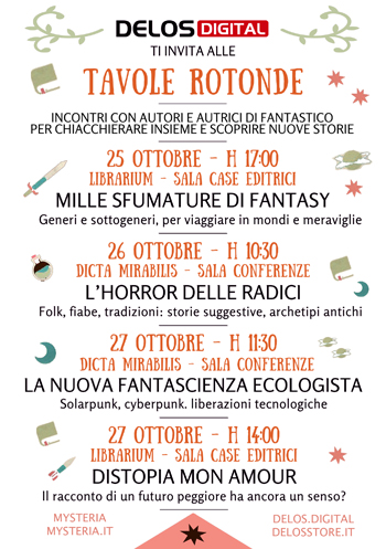 Io sarò presente per tutti e tre i giorni di fiera al tavolo Delos Digital, e modererò inoltre quattro incontri, dedicati a diverse e importanti articolazioni del fantastico: il fantasy, l’horror, il solarpunk e la distopia.